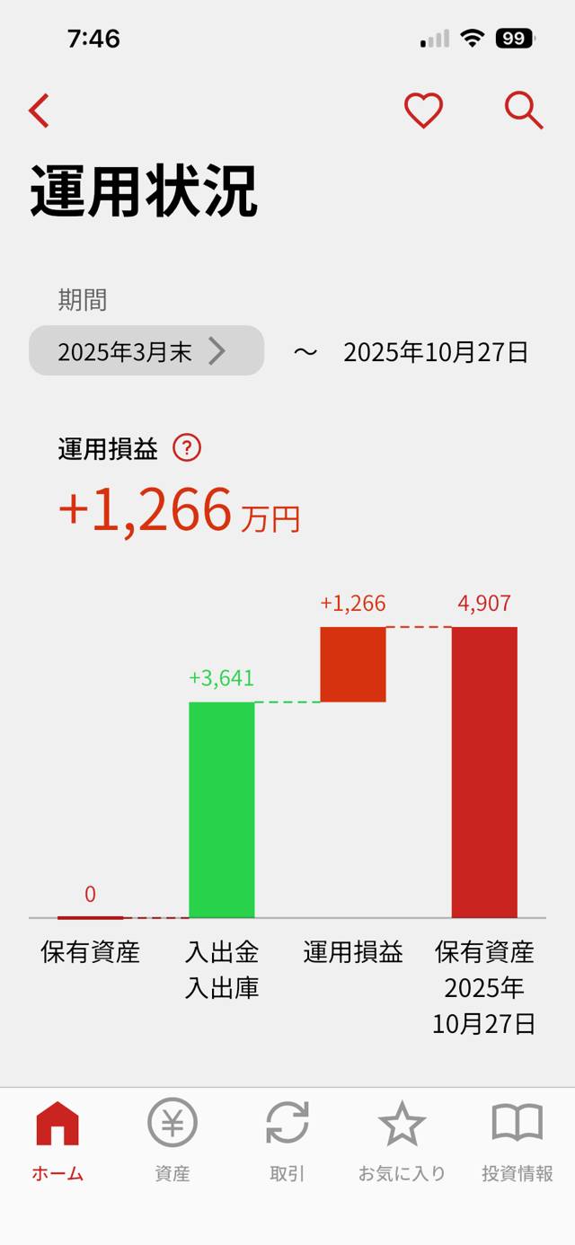画像の通り、3月末時点では残高ゼロでしたが、口座開設後に楽天から野村に移した証券が約3600万円ありましたが、その後の株価上昇でこれが膨らみ、現在、約4900万円となっています。