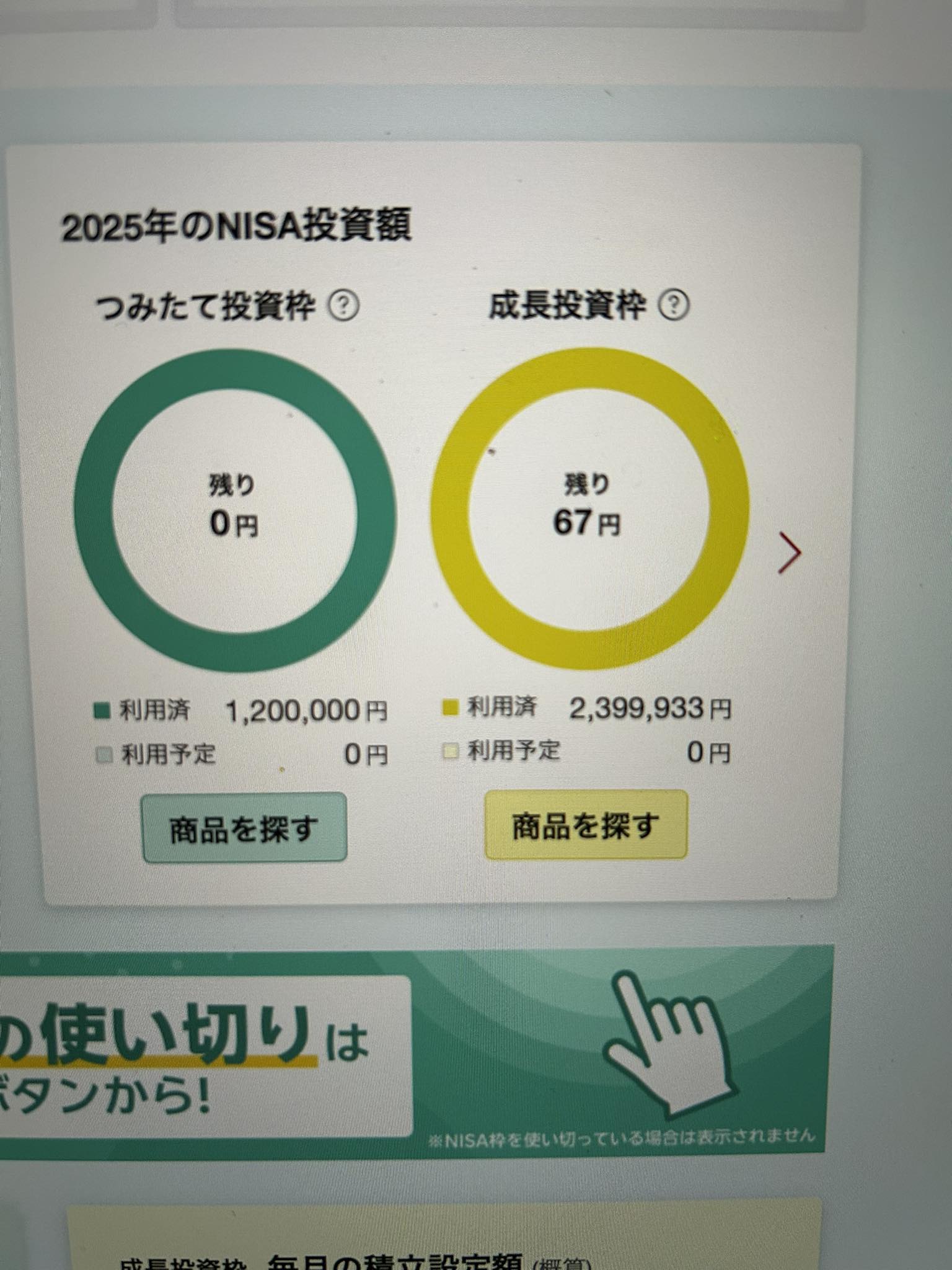一方、成長投資枠については、年初にほぼ全額日本株に投資し、細かい金額(1万円未満)はeMAXIS Slim 米国株式(S&P500)に投資しましたが、僅か67円だけ枠を未消化で終わりました。