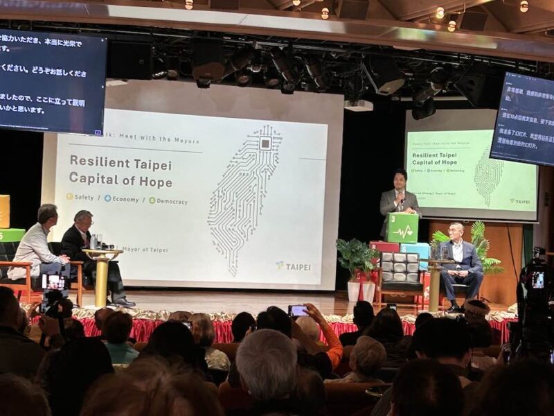 今回、ピースボートのパシフィックワールド号として初めての寄港だったことを記念として、基隆(キールン)および台北の両市長を本船に招いて、トークイベントが開催されました。(台北市長は蒋介石のひ孫)
